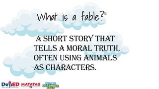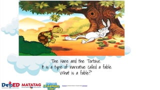 The document discusses different types of texts, focusing on narrative text, particularly Aesop's fable of 'The Tortoise and the Hare.' It details the characters, the plot, and the moral of the story, emphasizing themes of overconfidence and perseverance. The moral lessons conveyed include 'slow and steady wins the race' and the caution against being overconfident.