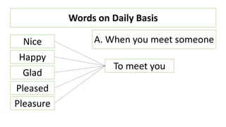 The document provides phrases and expressions for daily communication, including greetings, introductions, and responses to thanks and apologies. It emphasizes positive language and polite interactions in conversations. Additionally, a link to a YouTube channel is included for further resources.