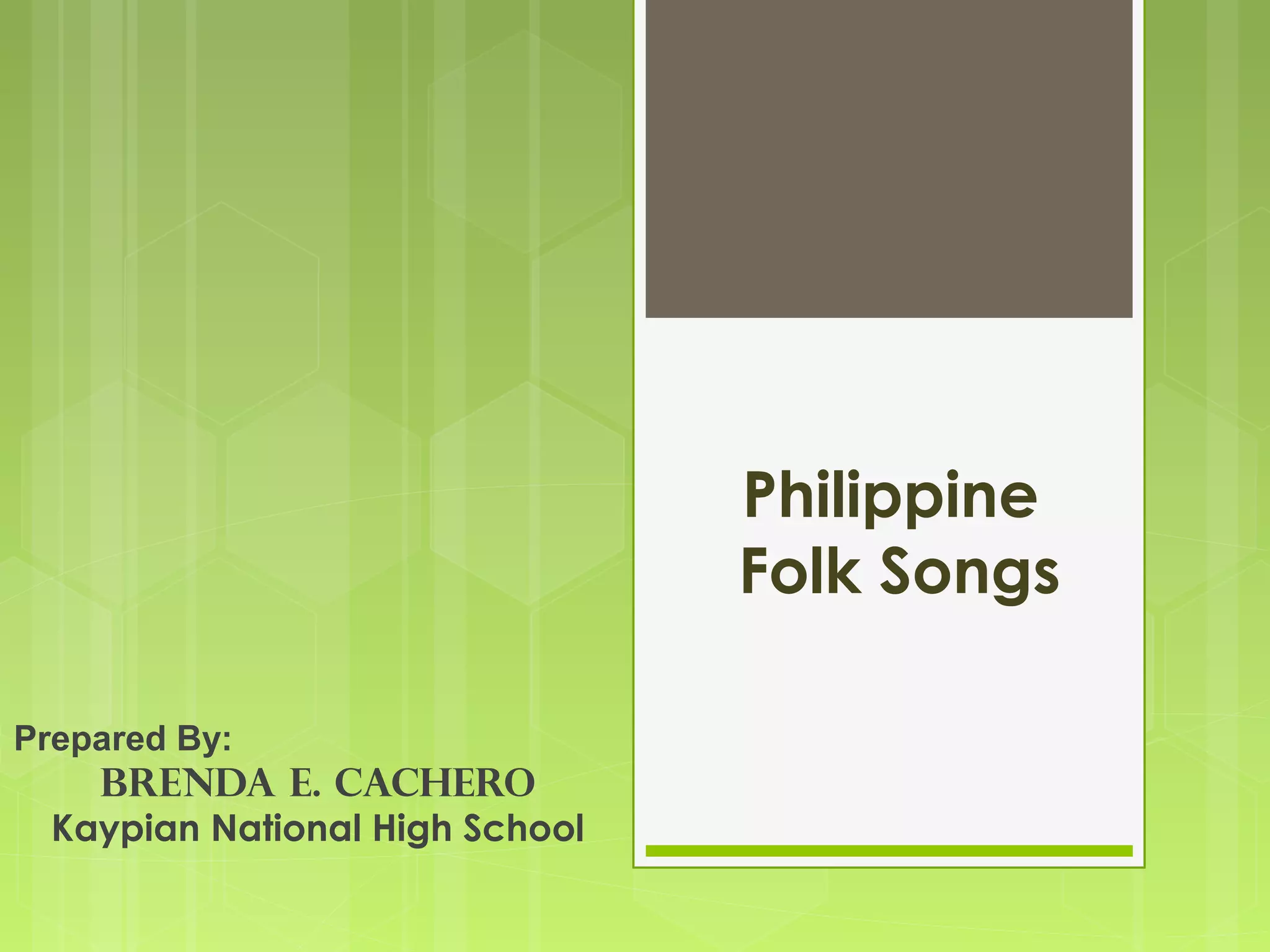 Ang dokumento ay tungkol sa mga kantang bayan ng Pilipinas, partikular sa mga mula sa mababang lupa ng Luzon. Tinalakay nito ang mga katangian at mga halimbawa ng mga awitin, na naipasa nang pasalita at may mga impluwensiya mula sa Espanyol at iba pang kulturang Kanluranin. Kabilang dito ang iba't ibang uri ng mga folk song tulad ng balad, lullabye, at mga kantang pampag-ibig, kasama ang mga tiyak na halimbawa mula sa iba't ibang wika sa rehiyon.