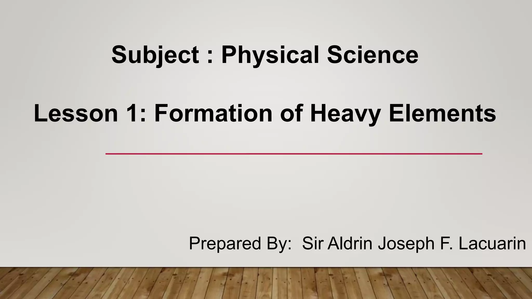 The document discusses the formation of heavy elements. It begins by providing background on physical science topics like astronomy, chemistry, geology, meteorology, and oceanography. It then discusses the Big Bang Theory and how light elements like hydrogen, helium, lithium, and beryllium were formed in the early universe. The document goes on to explain that heavier elements are formed through stellar nucleosynthesis, which is the process of fusing lighter elements into heavier ones inside stars.