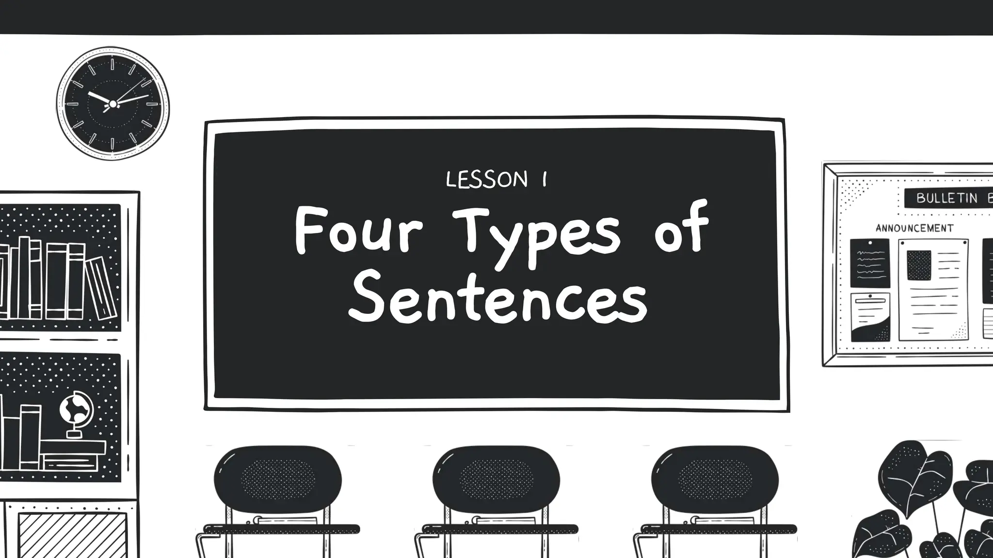 The document outlines the four types of sentences in English: declarative, interrogative, imperative, and exclamatory. Each type serves a specific purpose, from making statements to asking questions and expressing emotions. The lesson includes examples and prompts for writing sentences of each type using given objects.