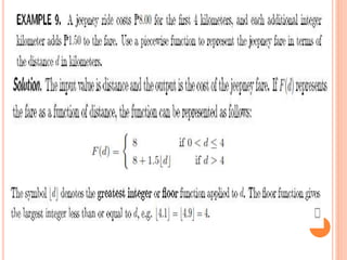 The document discusses functions and relations. It defines a relation as a rule that relates inputs from one set to outputs in another set, while a function relates each input to only one output. It provides examples of relations and functions. The key difference between relations and functions discussed is that a function pairs each input with only one output, while a relation can pair an input to multiple outputs. The document also discusses using functions to model real-life situations and how to represent functions graphically using a vertical line test.