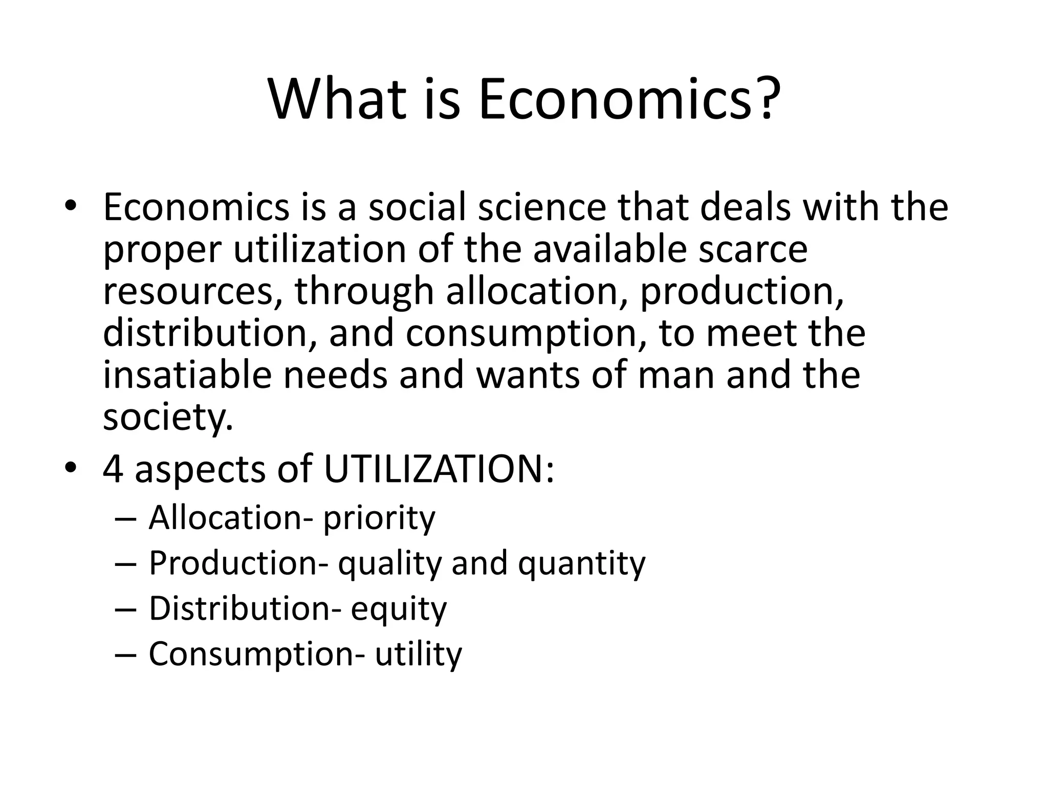 This document provides an introduction to economics, including definitions of key terms and concepts. It describes economics as dealing with scarce resource allocation to meet human needs and wants. It outlines the branches of microeconomics and macroeconomics. It also discusses the positive and normative views in economics and assumptions made in the study of economics, such as limited resources and unlimited wants. A brief history of economic thought is also presented, covering classical, neoclassical, Marxist, and Keynesian schools of thought. Finally, it outlines the three basic economic problems of what, how, and for whom to produce goods and services.