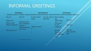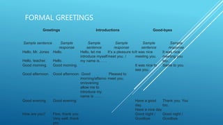 This document provides sample greetings, introductions, and goodbyes for formal and informal situations. For formal greetings, it suggests saying hello followed by the person's name and title or commenting on meeting them. For introductions it recommends stating one's name. For goodbyes, it lists responses like have a good day or evening. Informal greetings sample "Hey" or "What's up?" as openings, and introductions involve stating one's name. Goodbyes include "Take it easy" or "See you later." The document also lists questions to ask for personal information like names, ID numbers, email and phone numbers.