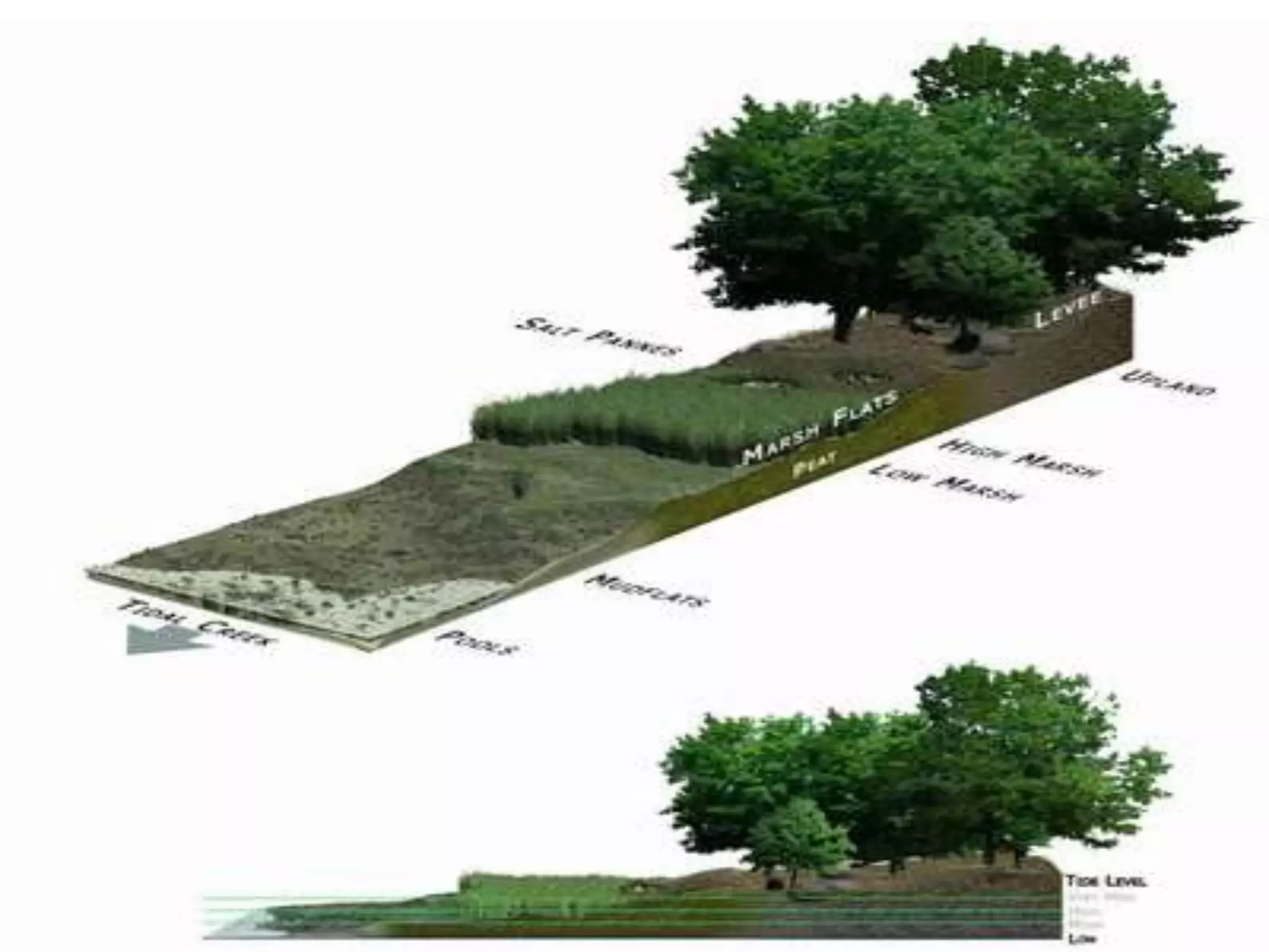 - Salt marshes are important estuarine ecosystems located between land and salt/brackish water. They support food webs and provide habitat for many species.