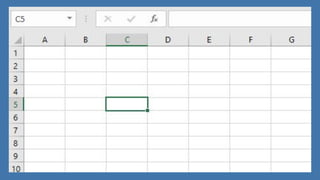 Microsoft Excel is a software program created by Microsoft that uses spreadsheets to organize numbers and data with formulas and functions. An Excel workbook contains three worksheets by default, each consisting of 65,536 rows and 256 columns where spreadsheets information such as text, numbers or formulas can be entered into cells. A cell is the intersection of a row and column, referenced by its column letter and row number. The active cell is where data entry occurs, identified by its border, reference in the top left, and highlighted column and row headings.