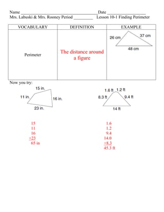 This document contains a math worksheet on finding perimeter. It defines perimeter as the distance around a figure and provides examples of calculating perimeter for different shapes. It also includes a word problem asking students to calculate the distance between two cities given the total distance traveled and distances between other city pairs forming a triangle.