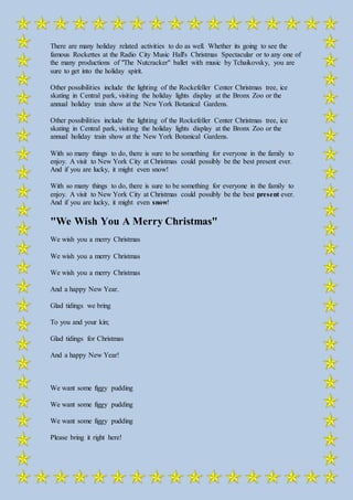 The document discusses how New York City is transformed into a magical Christmas wonderland during the weeks between Thanksgiving and New Year. Department store windows and street corners are decorated with holiday scenes and Christmas trees. There are many festive events and activities to enjoy such as the Radio City Christmas Spectacular and ice skating. Visiting during the holidays could make for the perfect holiday gift and experience.