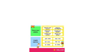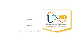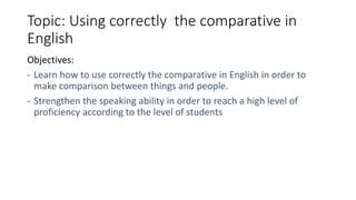 This English lesson focuses on correctly using comparatives in English. The objectives are to learn how to use comparatives to make comparisons between things and people, and to strengthen speaking proficiency. The lesson includes a warm-up asking students about decisions in life, reviewing what they know about comparatives, presenting information on comparative forms, providing practice with short video and conversation examples, and assessing students with a quiz.