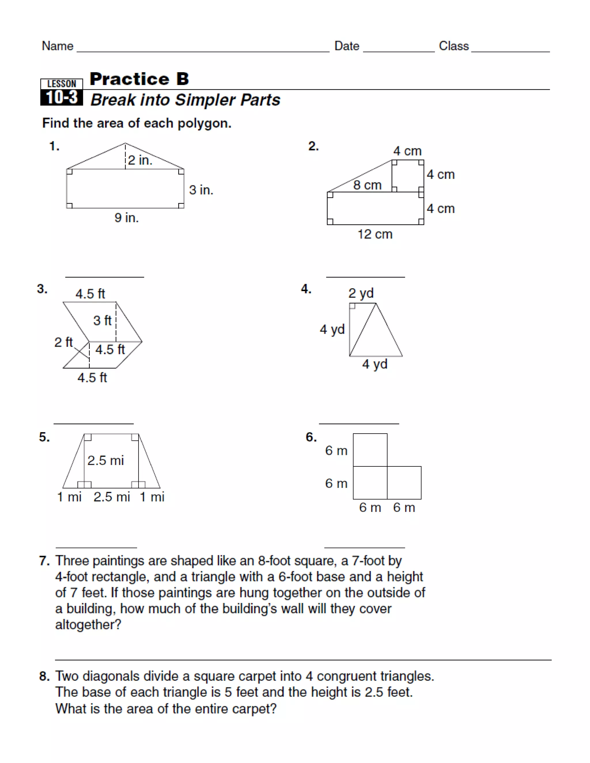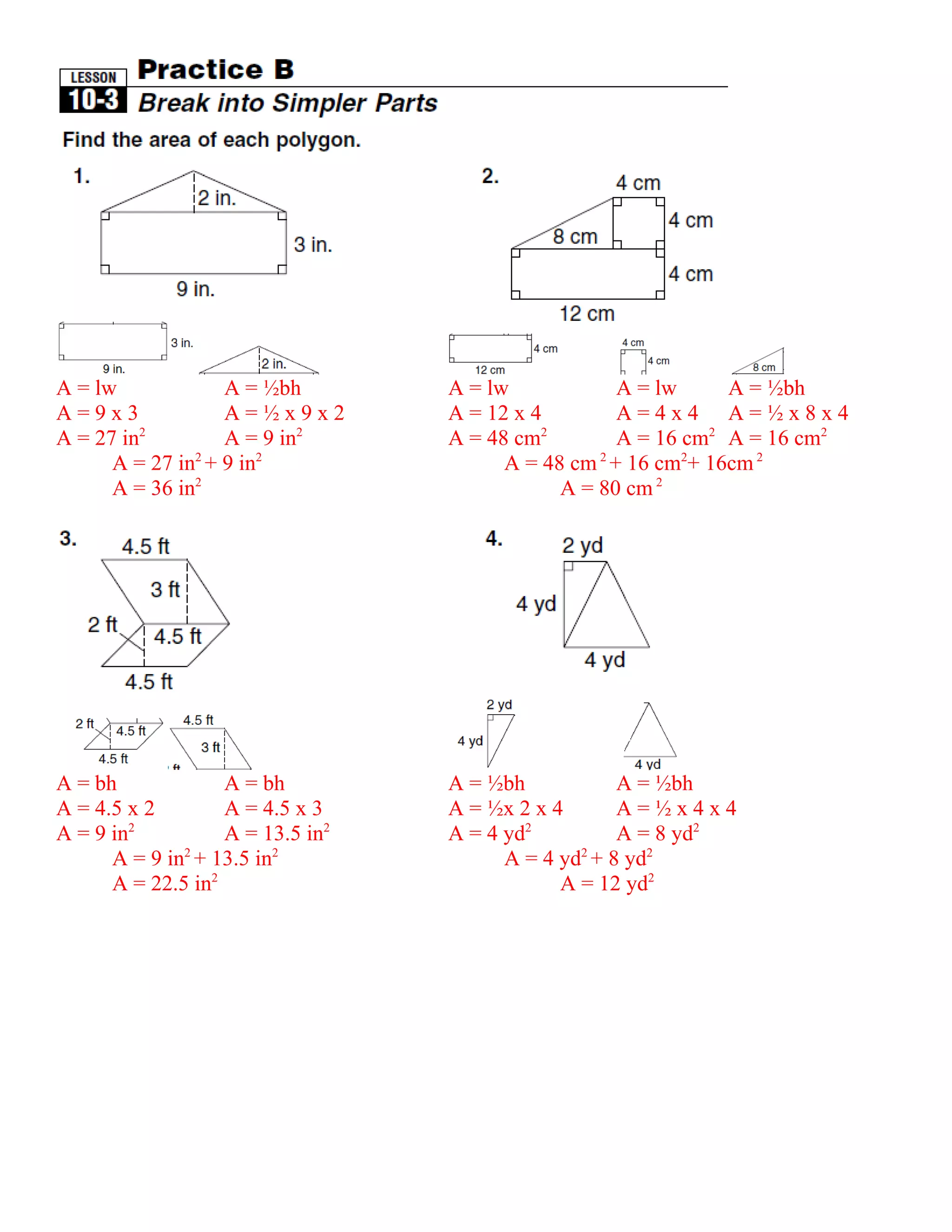 The document contains calculations of the area (A) of various shapes using the area formulas for rectangles (A = lw), squares (A = s^2), and triangles (A = 1/2bh). The areas are calculated in inches, feet, yards, and meters and then summed together at various points. In total, the document calculates over 20 separate areas and sums them to find combined areas.