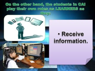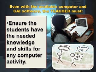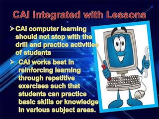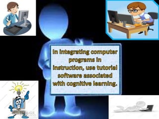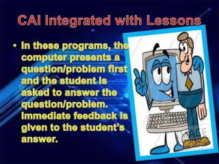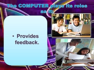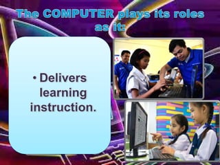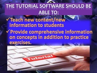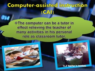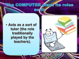 This document discusses the use of computers as tutors in education. It describes how computers and educational software can be used for individualized learning, drill and practice exercises, simulations, instructional games, multimedia encyclopedias, and electronic books. Some key points made include: