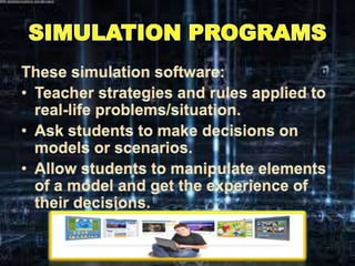 - Simulation and instructional games add elements of problem solving and competition to keep students engaged.