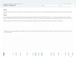 This document outlines an educational activity designed for students to reflect on communication with an alien species by answering various questions about national pride, Earth's qualities, and possible improvements before a hypothetical alien visit. Students will work in small groups and prepare to share their thoughts, fostering deeper understanding and critical thinking about humanity's place in the universe. The activity is part of a larger lesson plan within the 'First Contact Big History Project.'