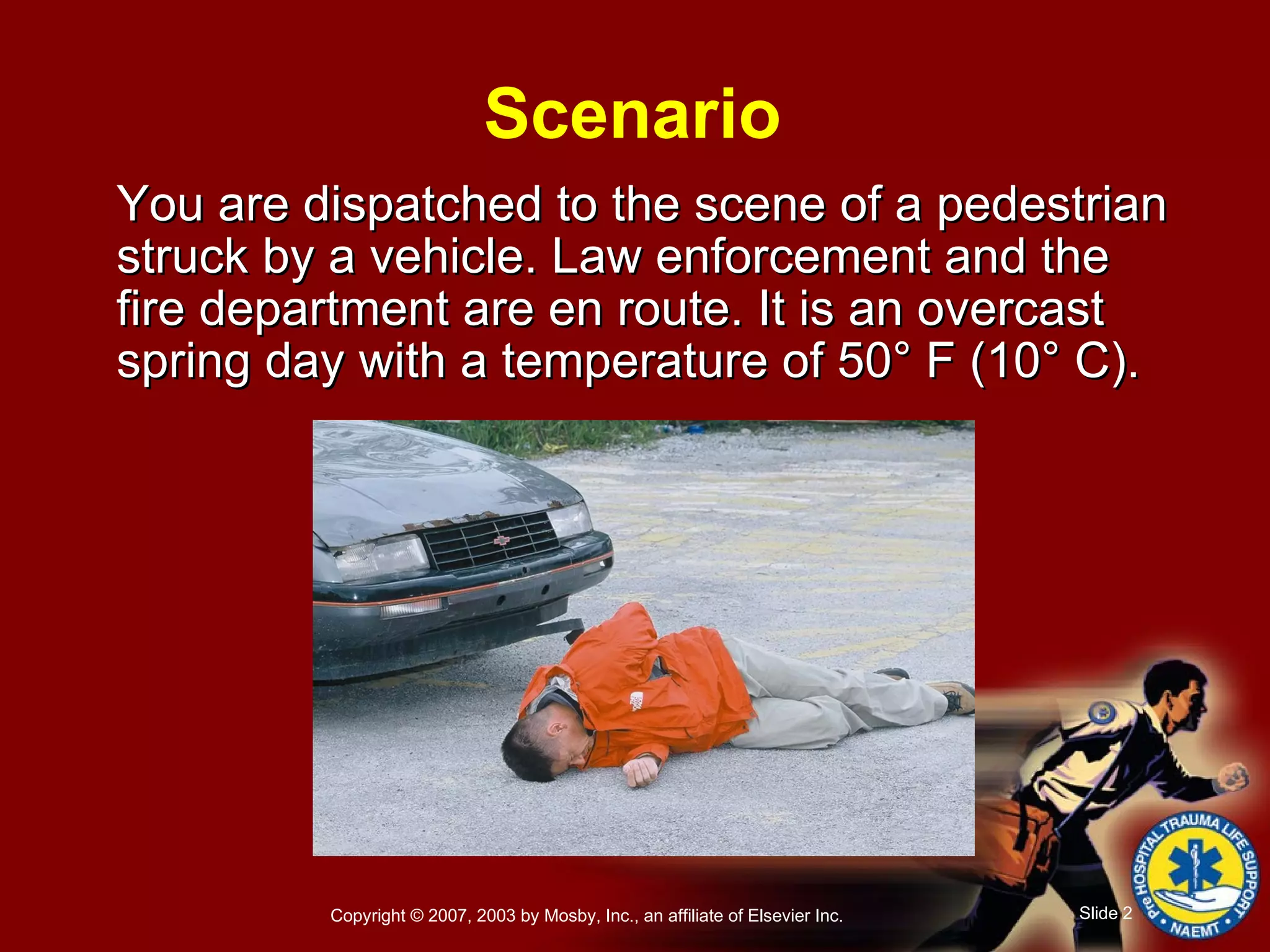 The patient has shallow breathing, cyanosis, bruising on the chest, and decreased breath sounds on the left side. The GCS score is 7 and oxygen should be delivered to maintain an SpO2 over 95%. Direct pressure controls bleeding from the right arm but the patient has a weak, rapid pulse of 140. There is pelvic crepitus and tenderness and a deformed left thigh, indicating shock. Basic shock therapy like warming and splinting should be provided, including consideration of a PASG. Spinal immobilization and rapid transport within 10 minutes are indicated.