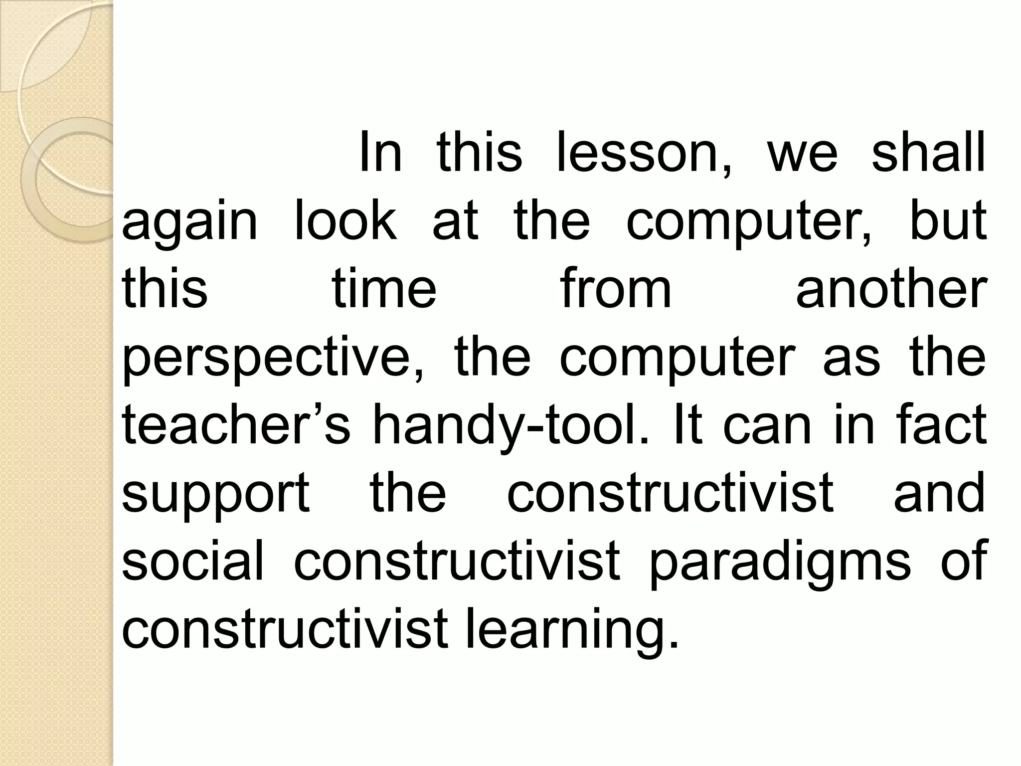 This document discusses how computers can support constructivist and social constructivist learning paradigms. It describes constructivism as knowledge constructed by individuals and social constructivism as knowledge constructed within social contexts. The computer is presented as a tool that can provide information, foster social knowledge building, and enhance communication. Specifically, it can serve as an informative tool, communication tool, constructive tool, co-constructive tool, and situating tool to support different aspects of individual and social learning.