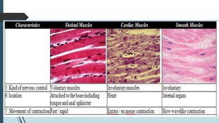 This document summarizes the main tissue types found in animals: epithelial, connective, supportive, vascular, muscular and nervous tissue. It describes the functions and examples of each tissue type. For epithelial tissue, it distinguishes between simple and stratified epithelia. For connective tissue, it outlines the fibers, inorganic substances and organic substances that make up the matrix. It also lists the main types of connective, supportive and vascular tissues.