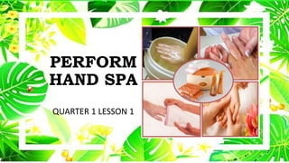 This document provides instructions for performing a hand spa treatment. It discusses analyzing a client's hand condition, preparing necessary supplies, and correctly following hand spa steps. It also covers nail structure, including the nail body, root, and free edge as well as structures beneath and surrounding the nail like the nail bed, matrix, lunula, cuticle, and eponychium. Nail growth rates and factors that influence growth are also addressed. The goal is to educate on providing nail care services and hand treatments.
