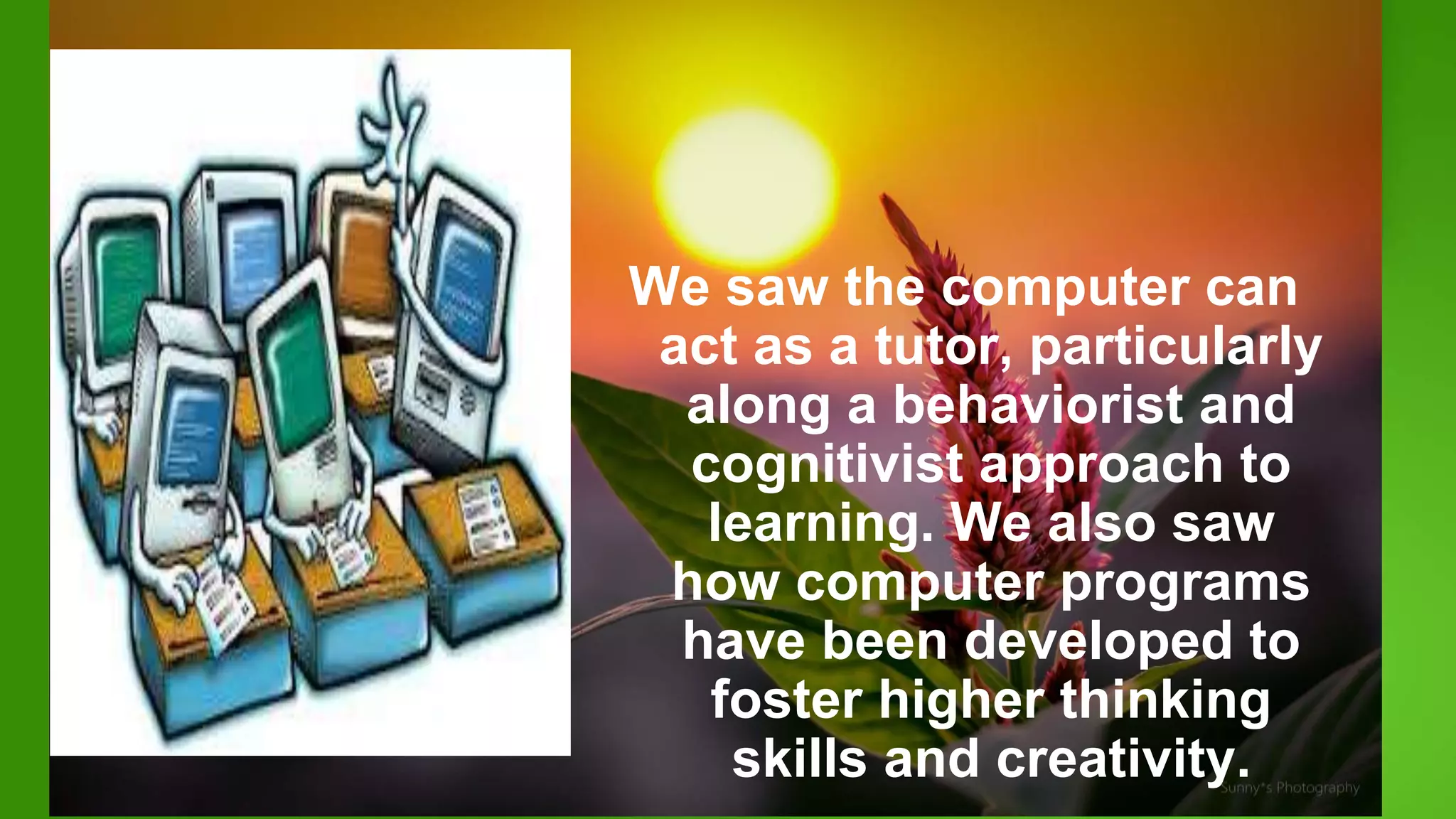 The document discusses how computers can be used as tools by teachers based on constructivist and social constructivist learning theories. It describes how computers can act as informative tools by providing vast amounts of information from the internet. Computers can also be communication tools through videoconferencing and discussion forums. They allow students to construct knowledge by manipulating information and organizing ideas. Computers further enable co-constructive learning through shared documents and note-taking. Finally, computers can situate students in virtual environments for simulated learning experiences.