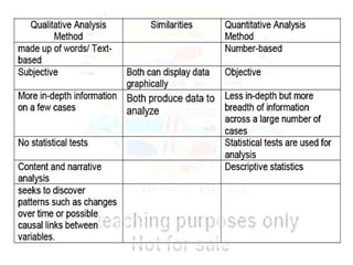 The document discusses various aspects of qualitative and quantitative data analysis methods. It provides details on 28 different steps, methods, and concepts for analyzing qualitative data, including developing codes, identifying themes, and summarizing data. It also outlines 4 steps for preparing quantitative data and describes common descriptive and inferential statistical analysis methods used. The document emphasizes intellectual honesty in research and analyzing data with suitable techniques.