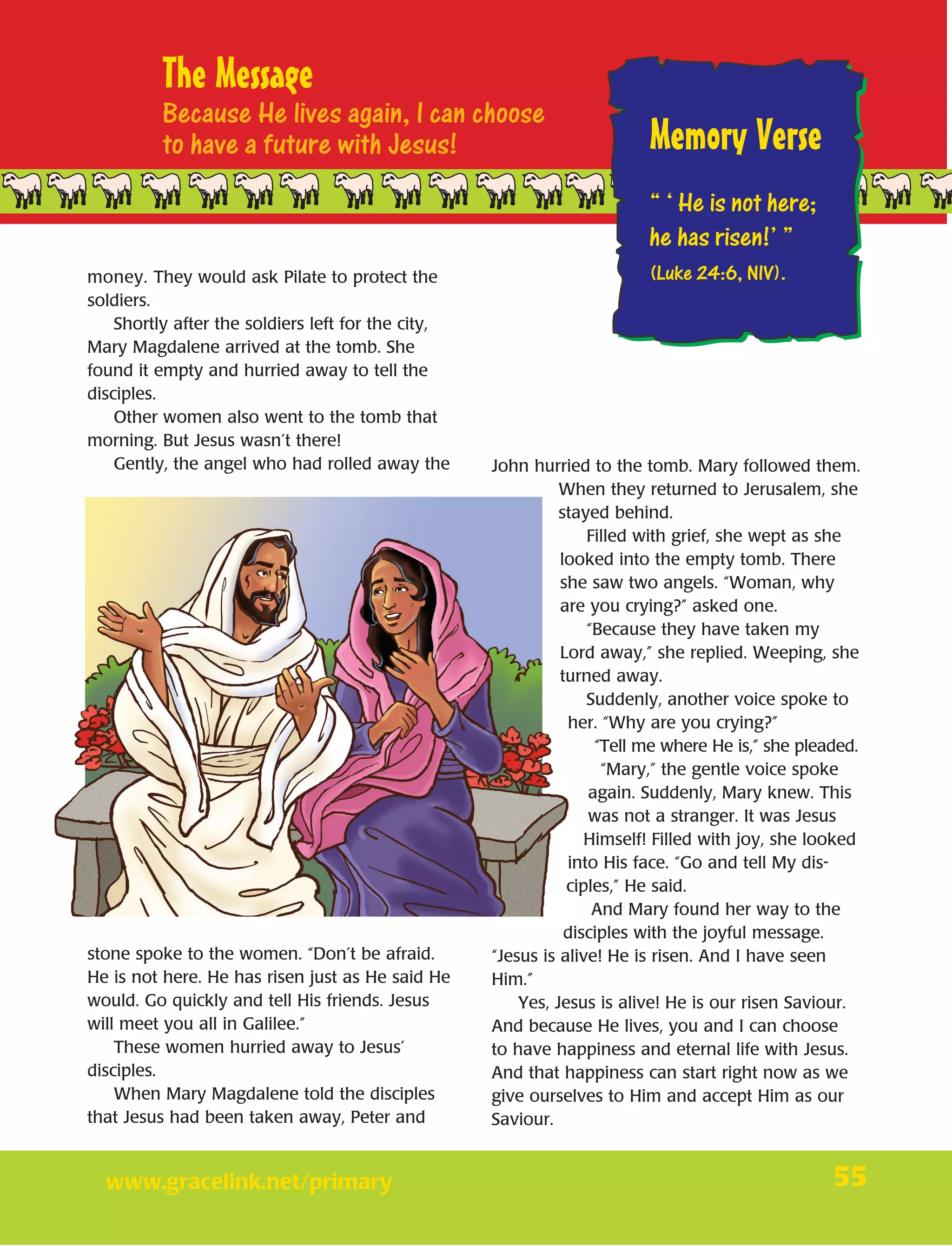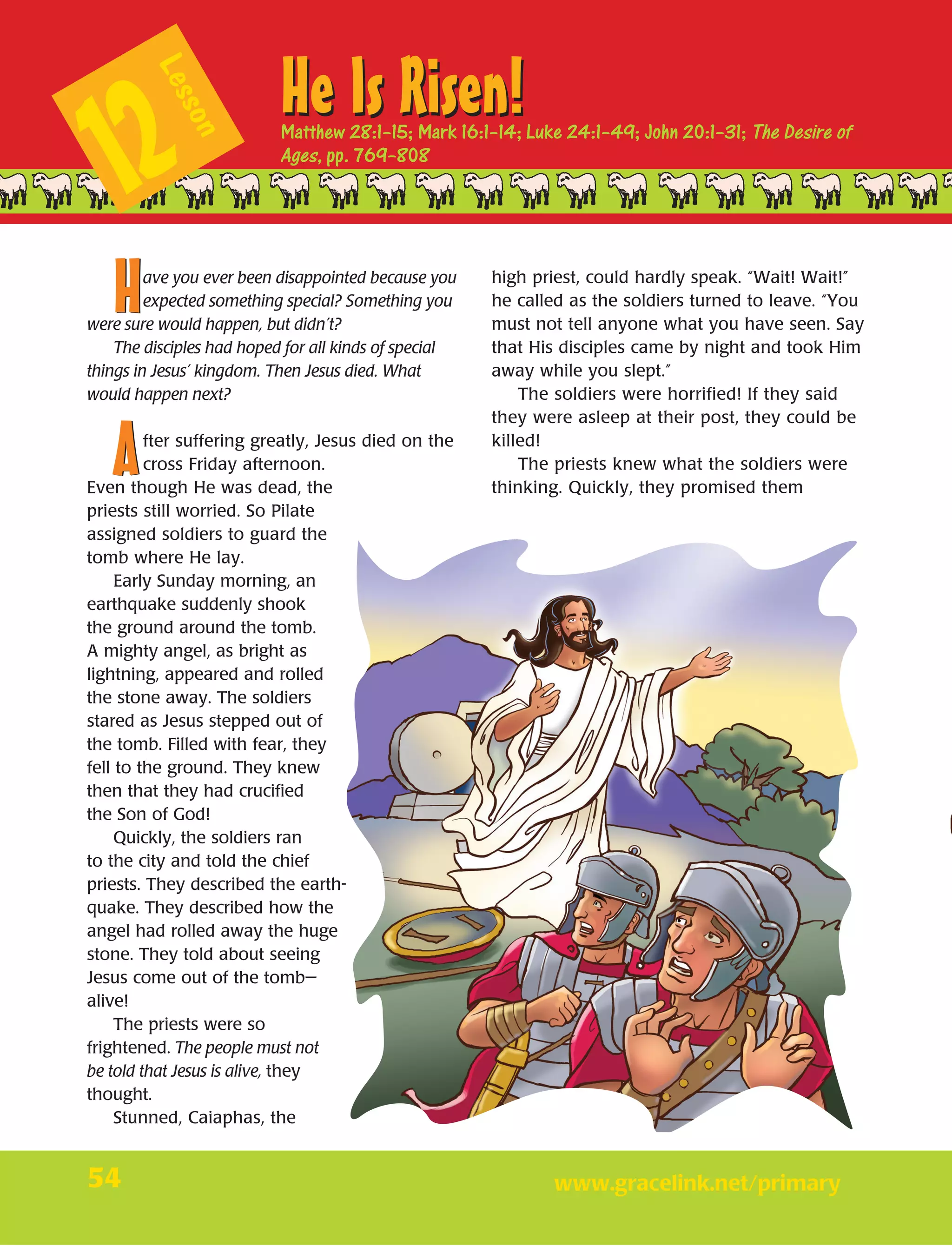 The disciples were disappointed after Jesus died, expecting Him to establish His kingdom. However, on Sunday morning Jesus rose from the dead. The soldiers guarding His tomb reported this to the priests, who bribed them to say the disciples stole Jesus' body. Mary Magdalene and other women also found the tomb empty, encountering angels who said Jesus was alive. Mary then told the disciples she had seen the risen Jesus.