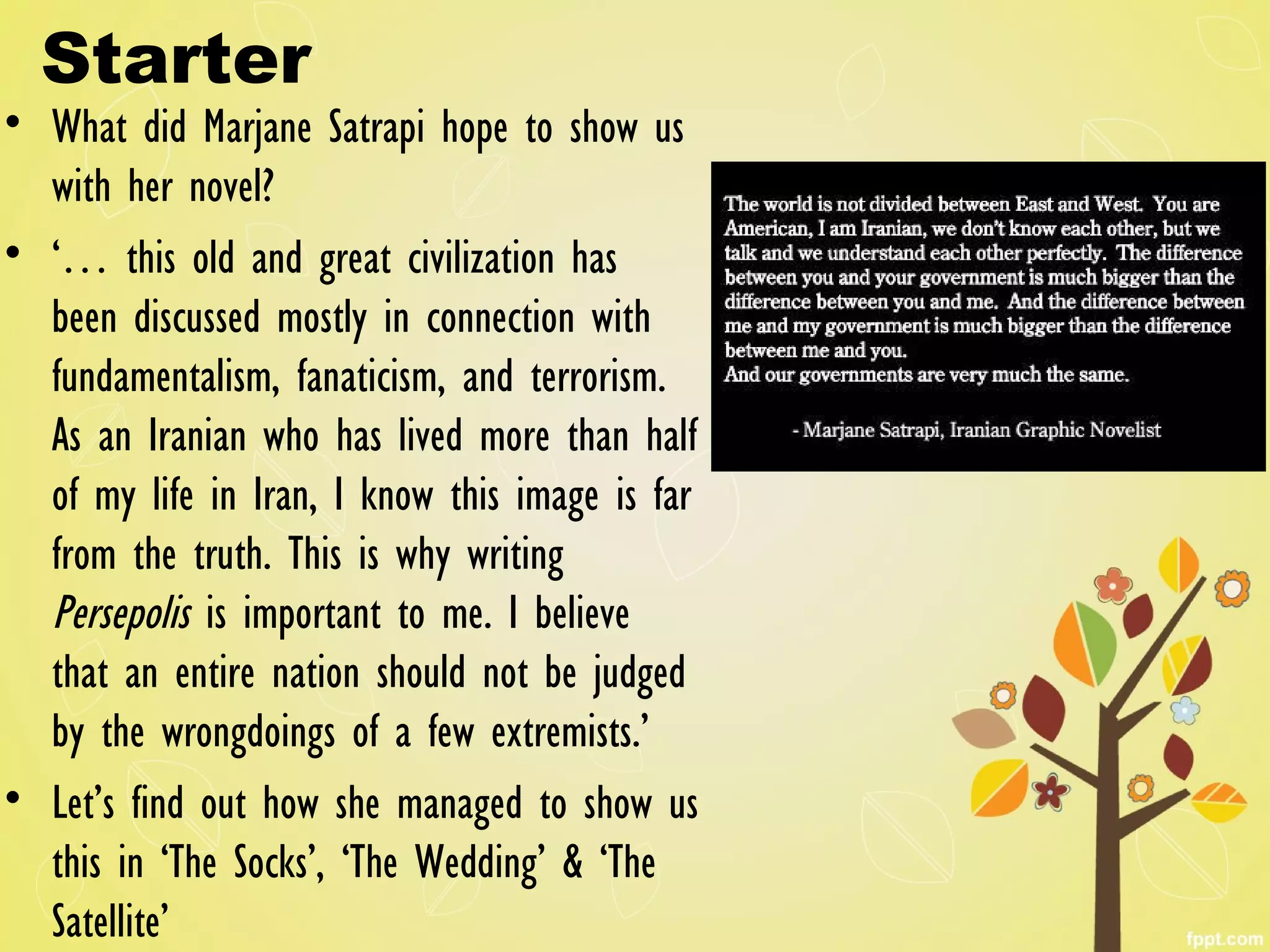 This document provides discussion questions and prompts for analyzing chapters from the graphic novel Persepolis by Marjane Satrapi. It summarizes that Satrapi hoped to show that Iran and its people are complex and should not be defined by extremism, as she experienced Iran. It prompts analyzing how Satrapi portrays Iranians navigating rules on sex, marriage, and technology to enjoy life. It discusses how Satrapi offers messages of resistance and depicts Marjane's wedding to show domestic life in Iran contrary to outside views.