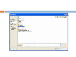 This document discusses how to insert movies into PowerPoint presentations from files or the clip organizer and customize movie playback options. You can insert movies by selecting the slide, clicking Insert, and choosing either "Insert a Movie from File" or "Movie from Clip Organizer." Various options allow you to control playback, volume, and more. The challenge is to practice inserting movies from files and clips and modifying options in a sample presentation.