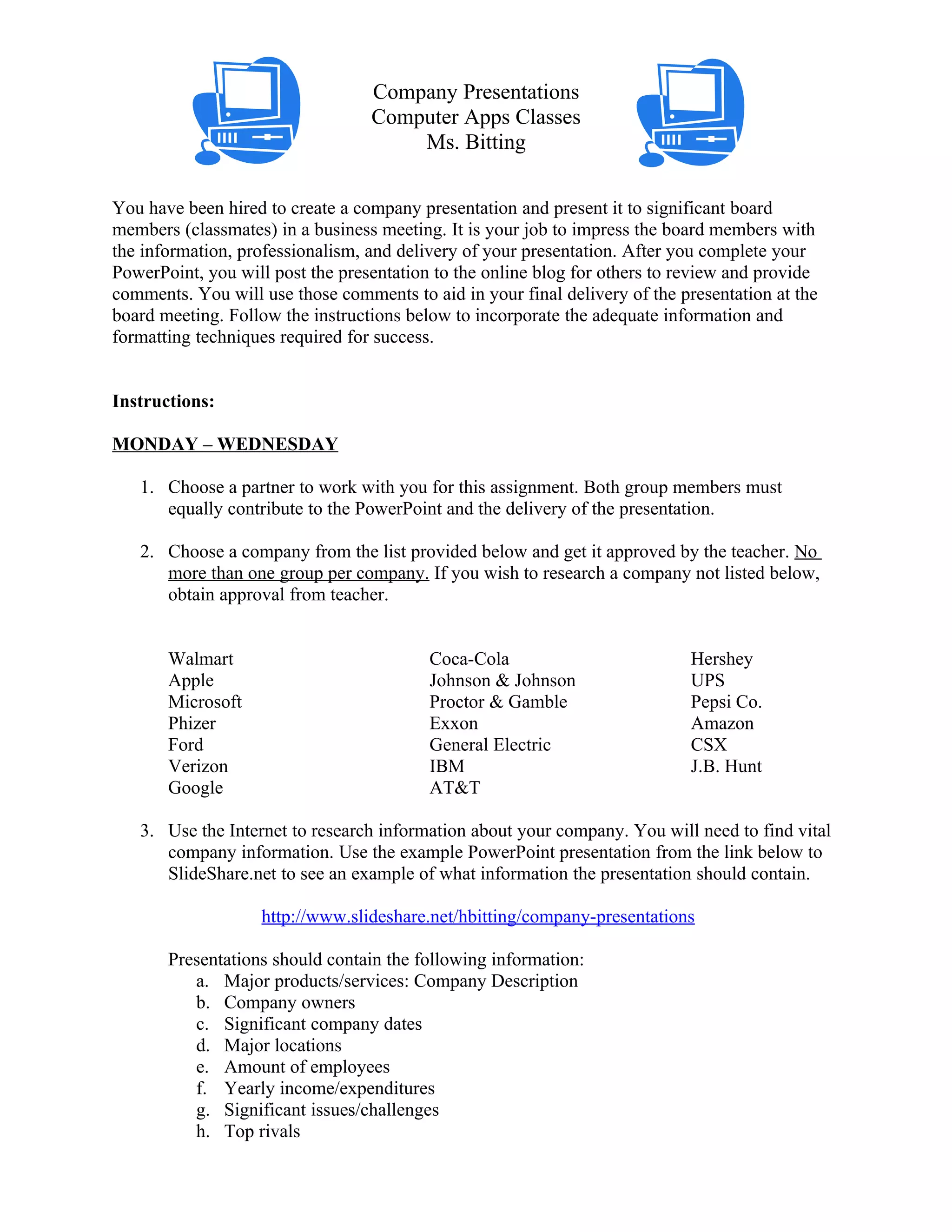 Students are tasked with creating and presenting a company presentation in groups, which should include various essential company information. The project involves researching a company, preparing a PowerPoint with at least 10 slides, and obtaining feedback from classmates via an online blog. Presentations will be delivered in class, requiring professionalism and adherence to a grading rubric.