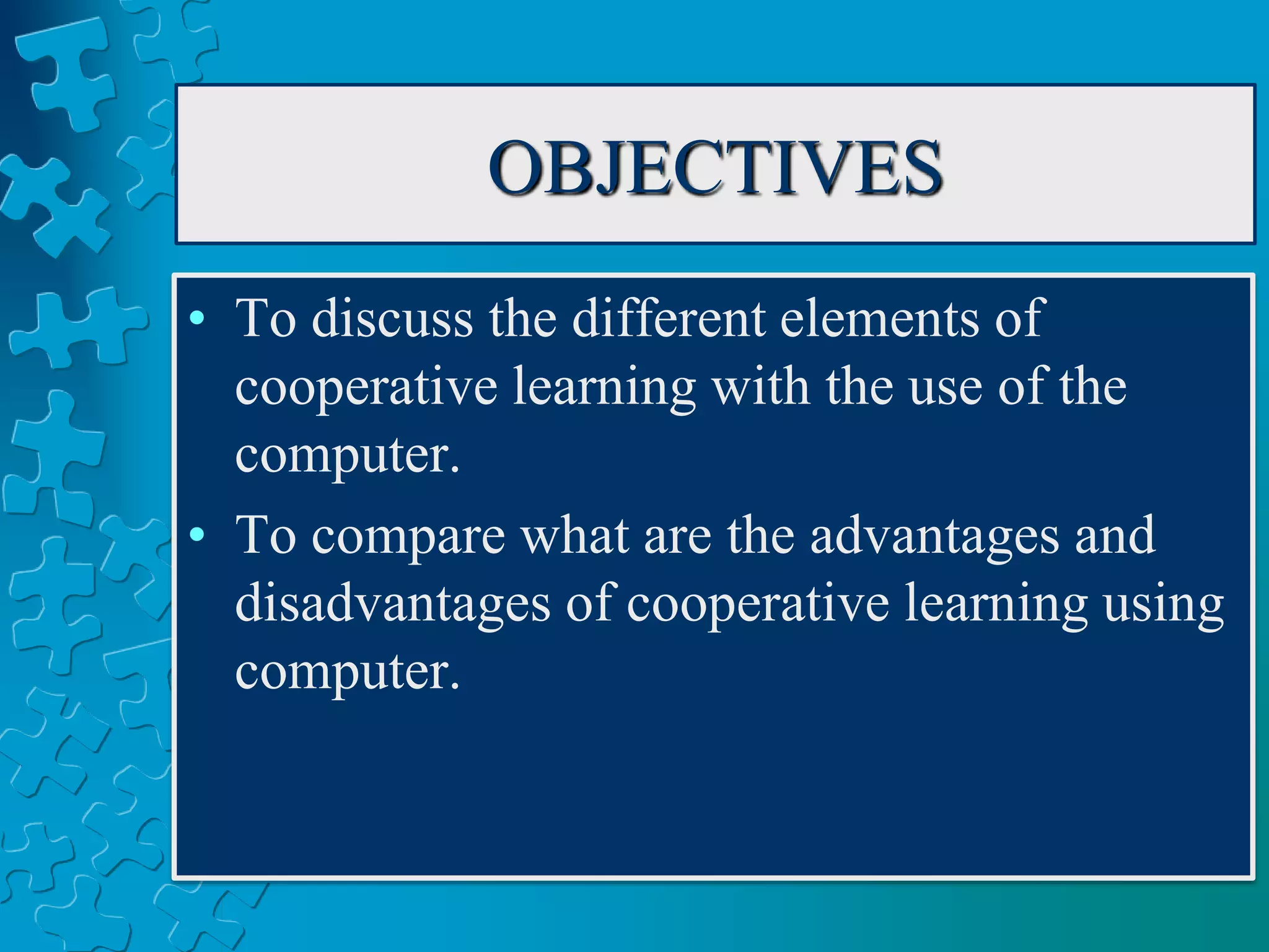 This document discusses cooperative learning with computers. It defines cooperative learning as students working in small groups on a common task. Five elements are needed: a common goal, interdependence, interaction, individual accountability, and social skills. Advantages include improved performance and social skills, while disadvantages include some students doing less work. Cooperative learning can work with computers if teachers assign mixed groups and ensure positive interaction and accountability. Overall, computers may facilitate cooperative learning if used as a group tool rather than individually.
