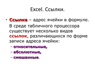 Документ содержит информацию о различных типах ссылок в Excel: относительных, абсолютных и смешанных, а также примеры их использования. Он объясняет, как копирование формул влияет на адресацию ячеек и предлагает задания для практической проверки понимания темы. Также представлены примеры вычислений значений формул в зависимости от типа ссылки.