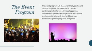 The document discusses event programming and protocols. It provides guidance on structuring event programs based on goals, budgets and attendees. It outlines categories of event activities and considerations for program flow, timing, speakers and formats. It also discusses protocols for VIP events, including seating arrangements, introductions and catering to cultural customs. Managing protocols is essential for events with officials to ensure all rules are followed.