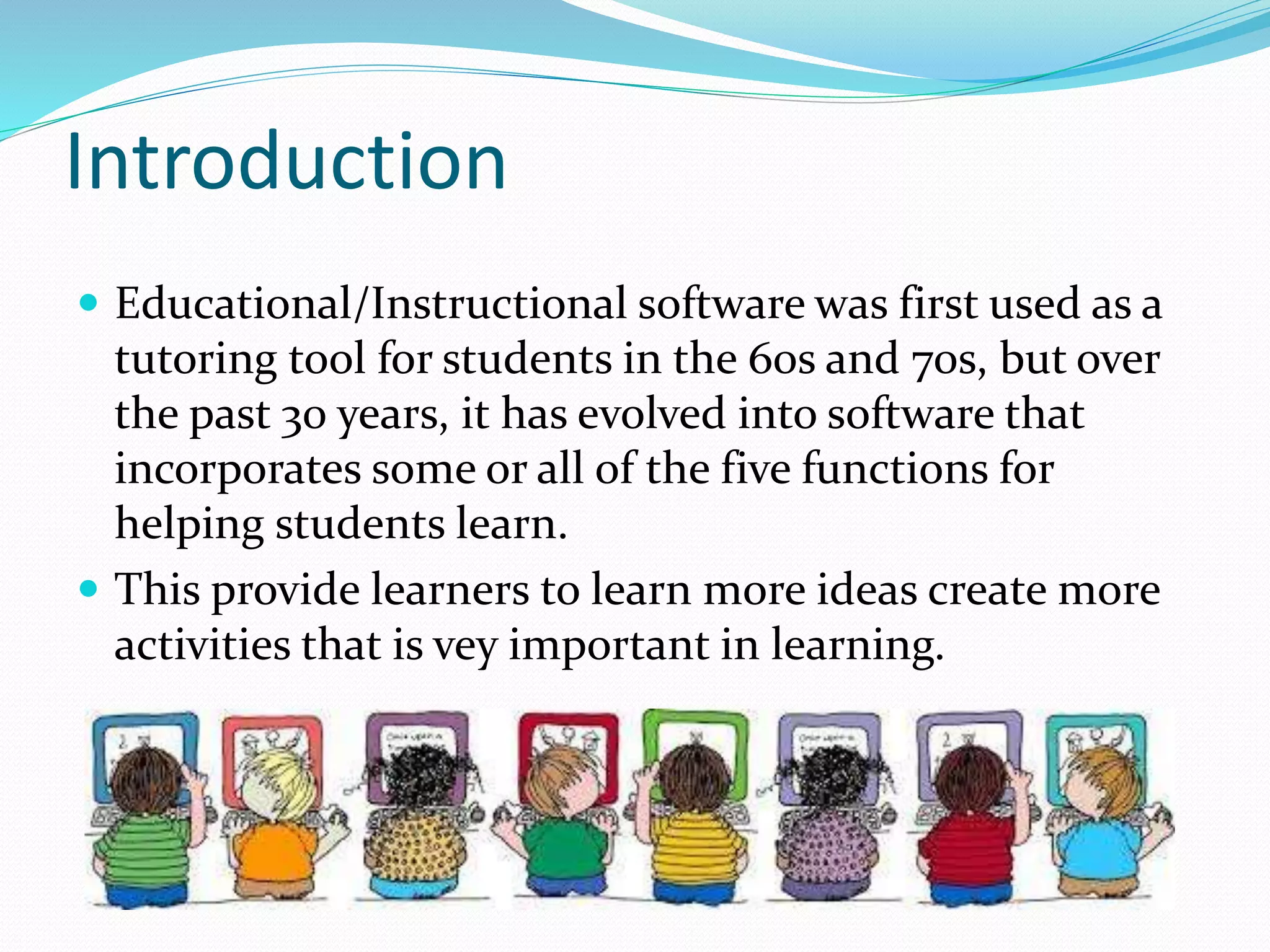 This document discusses instructional software and its uses in education. It defines instructional software as software that incorporates functions like tutoring, simulations, and games to help students learn. It notes that while initially used as tutoring tools, instructional software has evolved to blend multiple categories of functions. Universities and companies now develop educational software. The objectives of instructional software are to substitute some teacher roles, provide different learning resources, and produce computer-literate students. It also distinguishes system software, which manages hardware, from application software, which performs tasks. Finally, it lists seven categories of instructional software and reflects on using software creatively in teaching.