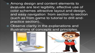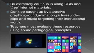 This document discusses computer software and Microsoft Windows. It defines software as programs that allow computers to perform tasks. There are two types of software: system software like operating systems, and application software for specific tasks. Microsoft Windows is a common operating system featuring a graphical user interface. It uses icons and menus to provide an easy interface between users and computer operations. Windows provides user convenience through clicking files and programs, an updated visual design, and integrates internet functions. Schools must carefully evaluate computer-based educational materials for quality and appropriateness.