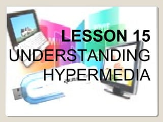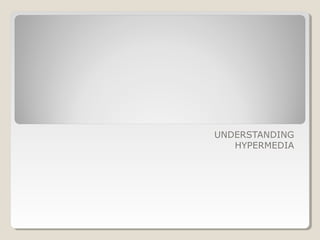 This document discusses hypermedia and its characteristics. Hypermedia is like multimedia packaged as an educational software that presents information and integrates student activities in a virtual learning environment. It sequences information and learning activities in a non-linear way, allowing learners to follow their own path and promoting autonomy and thinking skills. Key characteristics of hypermedia applications include learner control over their path and pace, a wide range of navigation routes, and the use of multiple media types like text, graphics, audio, and video, though not necessarily all types in one presentation.