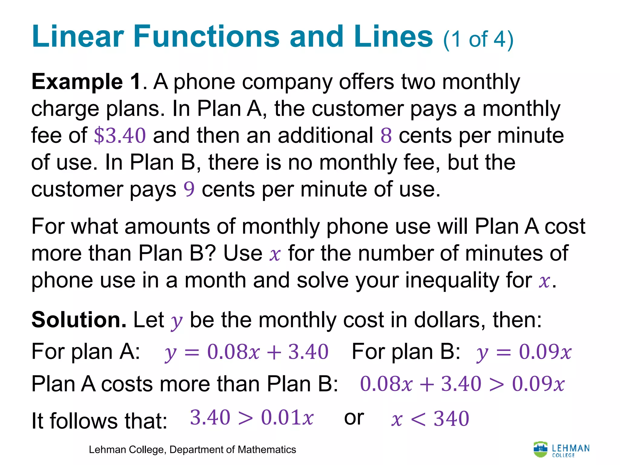2) Example 1 involves setting up and solving linear inequalities to determine the monthly phone plans.
