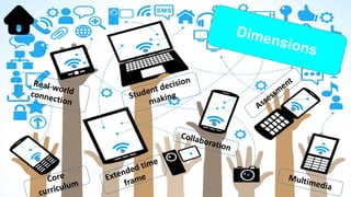 This document discusses project-based multimedia learning, which involves students planning, designing, and producing a multimedia product. It describes key dimensions of project-based multimedia learning, including using a core curriculum, making real-world connections, extending over a significant time frame, allowing student decision making, encouraging collaboration, assessing student learning and products, and having students create their own multimedia rather than just using others'. It also notes some potential limitations, such as needing an extended time period and basic computer skills.