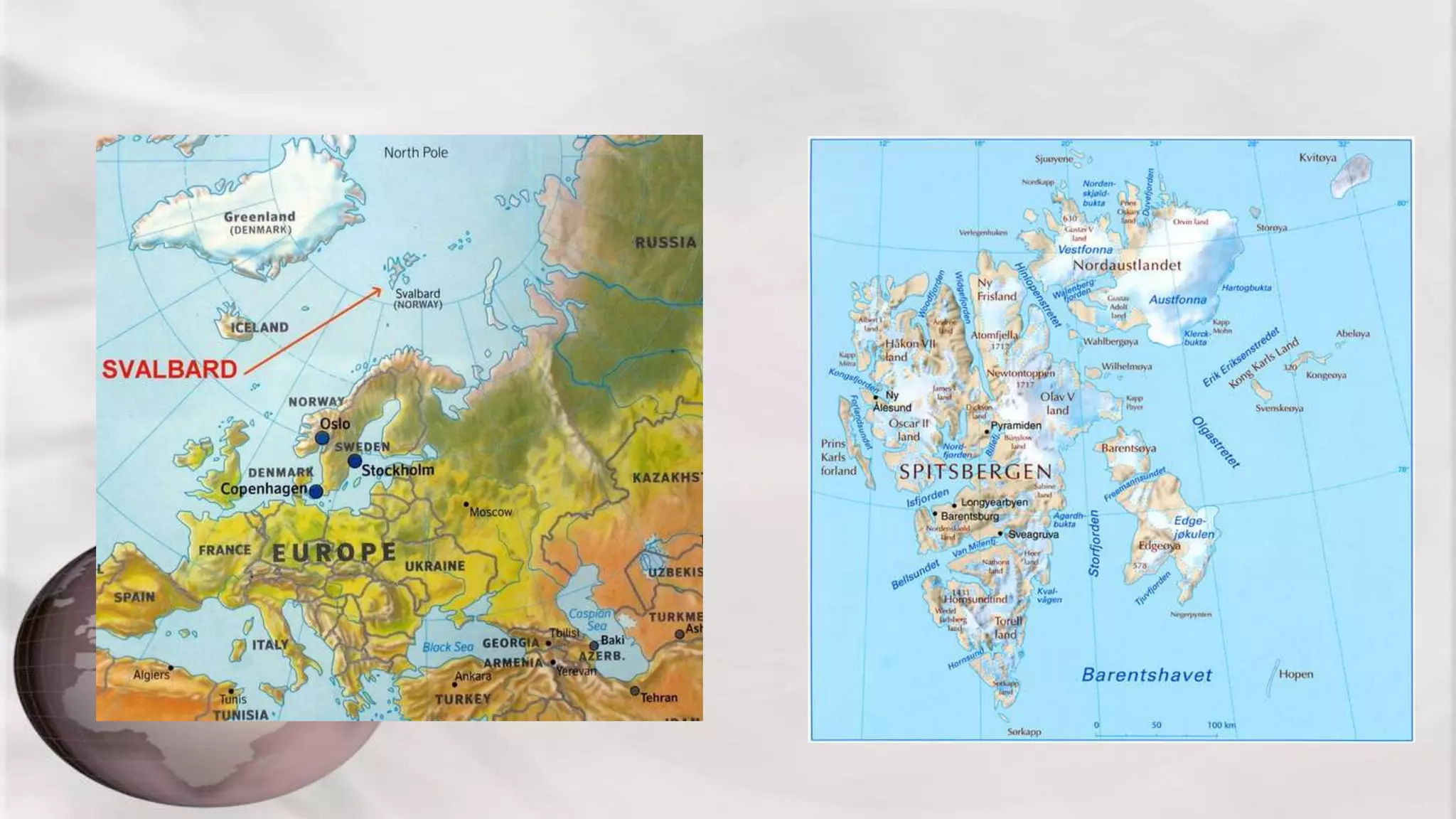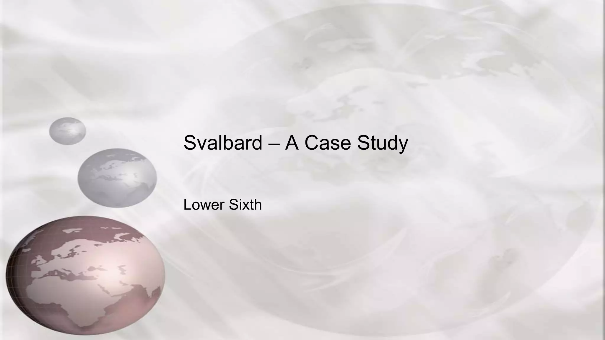 Svalbard is a Norwegian archipelago located between Norway and the North Pole that has a population of around 3,500 people and 3,000 polar bears. It has a relatively mild climate compared to other Arctic regions and 60% of its land is covered in ice. The islands have a history of whaling and coal mining, which still provides a third of jobs today. However, coal mining is controversial as it is dirty and environmentalists want it ended. Polar research and tourism are also major industries, but both can damage the environment through infrastructure, waste, and stressing wildlife. To balance development and protection, two-thirds of Svalbard's land is now protected by national parks and reserves.