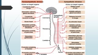 The document discusses the nervous and endocrine systems, detailing the types of neurons, neural circuits, and brain structures. It highlights the differences between the nervous and endocrine systems in terms of signaling and response times. Additionally, it provides a brief overview of human body systems and their functions.