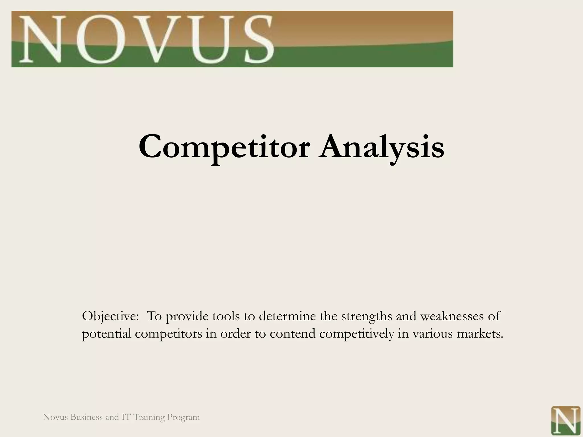 The document outlines the objectives and methods for conducting a competitor analysis in order to understand strengths and weaknesses in various markets. It highlights the importance of gathering comprehensive information about competitors and analyzing customer behavior to develop effective strategies. Additionally, it introduces Michael Porter's competitive matrix as a framework for assessing competitor capabilities and formulating responses to market dynamics.