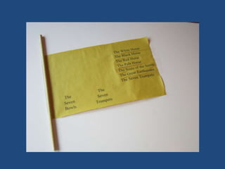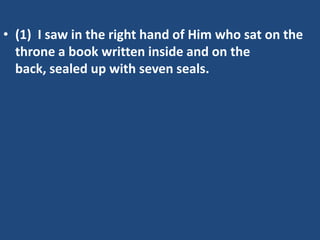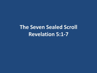 The seven sealed scroll in Revelation 5 represents a deed of redemption. Each seal that is broken reveals what must occur for the kinsman redeemer to repossess what was lost. No one was found worthy to open the scroll until the Lion from the tribe of Judah, Jesus Christ, was revealed as having overcome sin and death to redeem mankind. Jesus is described as both the sacrificial Lamb that was slain, referring to his first coming, and the Lion referring to his second coming as sovereign judge.