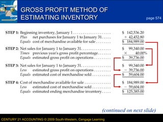 This document discusses methods for estimating inventory levels. It introduces the gross profit method, which estimates inventory by working backwards from actual gross profit to calculate an estimated cost of goods sold and ending inventory. It continues explaining the gross profit method over multiple slides. The final slide provides a term review that reinforces the gross profit method of estimating inventory levels.