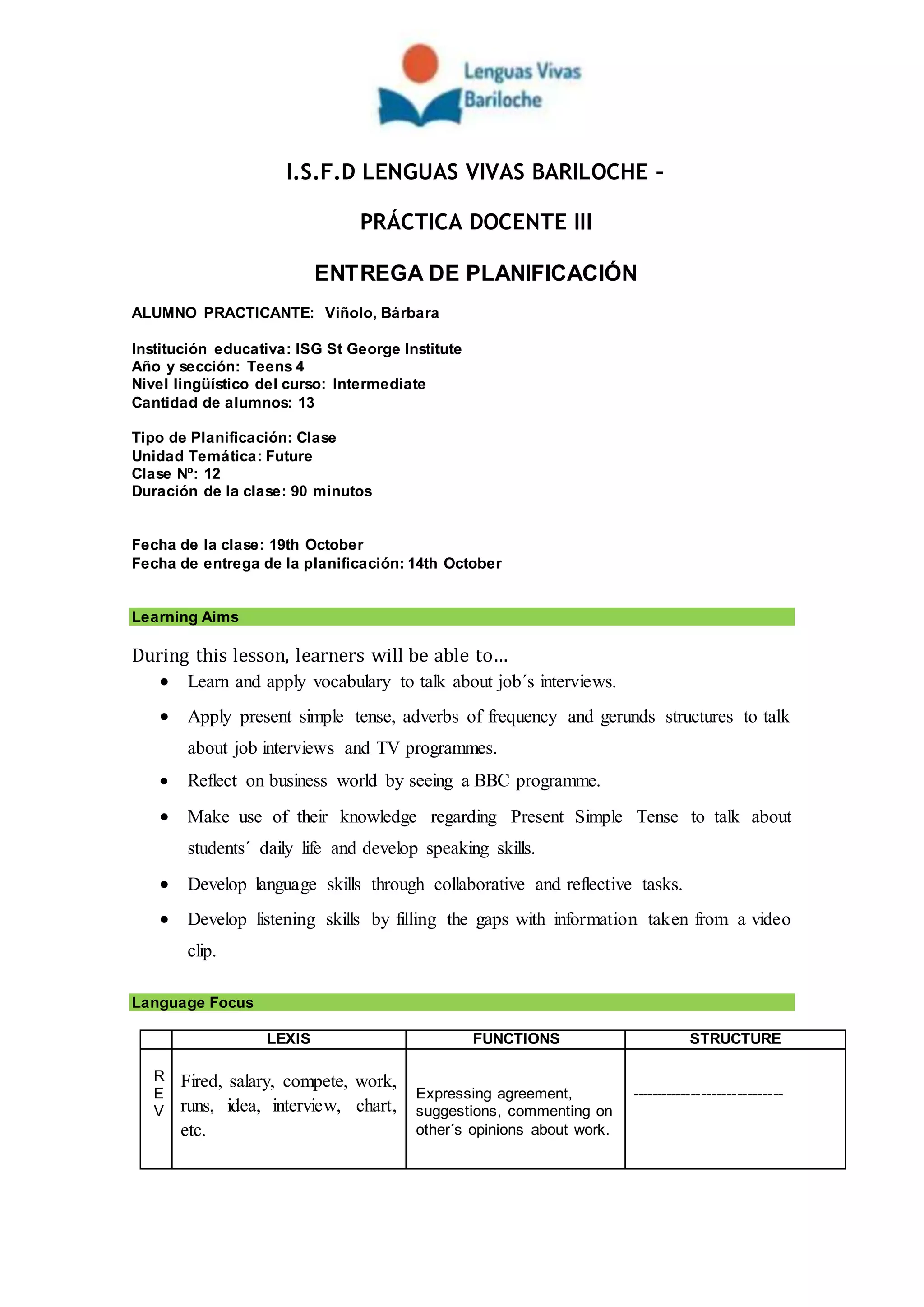 This lesson plan is for an intermediate English class of 13 students. The lesson focuses on vocabulary for job interviews and daily routines. Students will watch videos about dream jobs and job interviews. They will discuss comedy TV shows and read about someone's first day at a new job. Students will practice job interview phrases and describe a typical day in their life. The lesson incorporates listening, speaking, reading and writing activities with scaffolding to support student comprehension and language development.