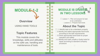 The document provides an overview of a computer system servicing module focused on the safe use and maintenance of hand tools. It includes planning and preparation for tasks, identifying appropriate tools, checking for safety, and various educational activities related to tool maintenance and safety procedures. Additionally, it features a series of questions aimed at assessing knowledge and understanding of hand tools and their proper use.
