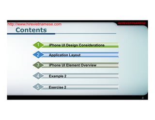 This document provides an overview of iPhone user interface design considerations and elements. It discusses keeping the UI simple given the iPhone's small screen size and touch interface. Common layouts like tab bars and navigation bars are described. Basic UI elements such as switches, segmented controls, pickers, and alert views are also outlined. The document aims to help designers create intuitive and easy-to-use iPhone apps.