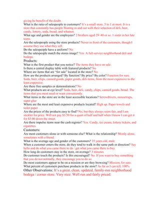 The store has a clean and well-lit environment with sparse but well-maintained merchandise arranged functionally. Employees are friendly and help customers within 30 seconds, treating all customers equally. The store carries reasonably priced everyday items like food, drinks, and household goods located at eye level and near the register. Customers appear to be on a mission, spend about 3 minutes shopping, and all seem to purchase something.