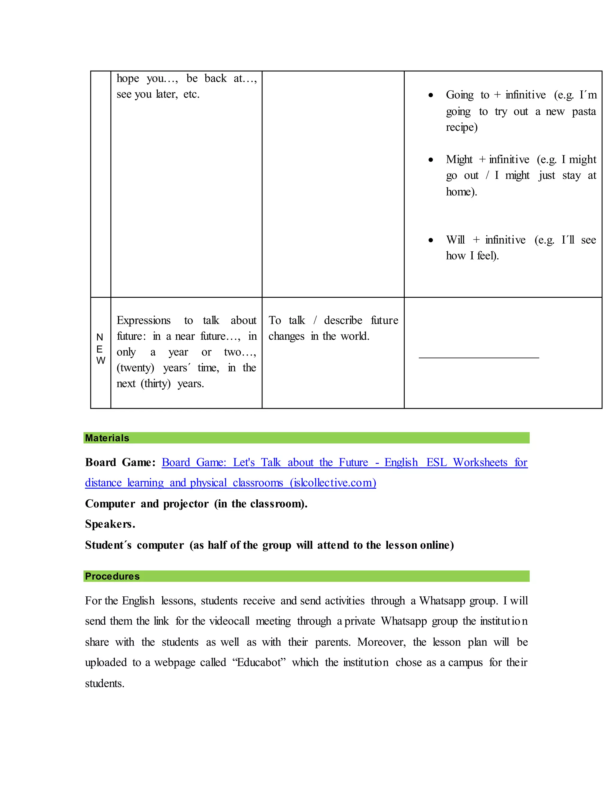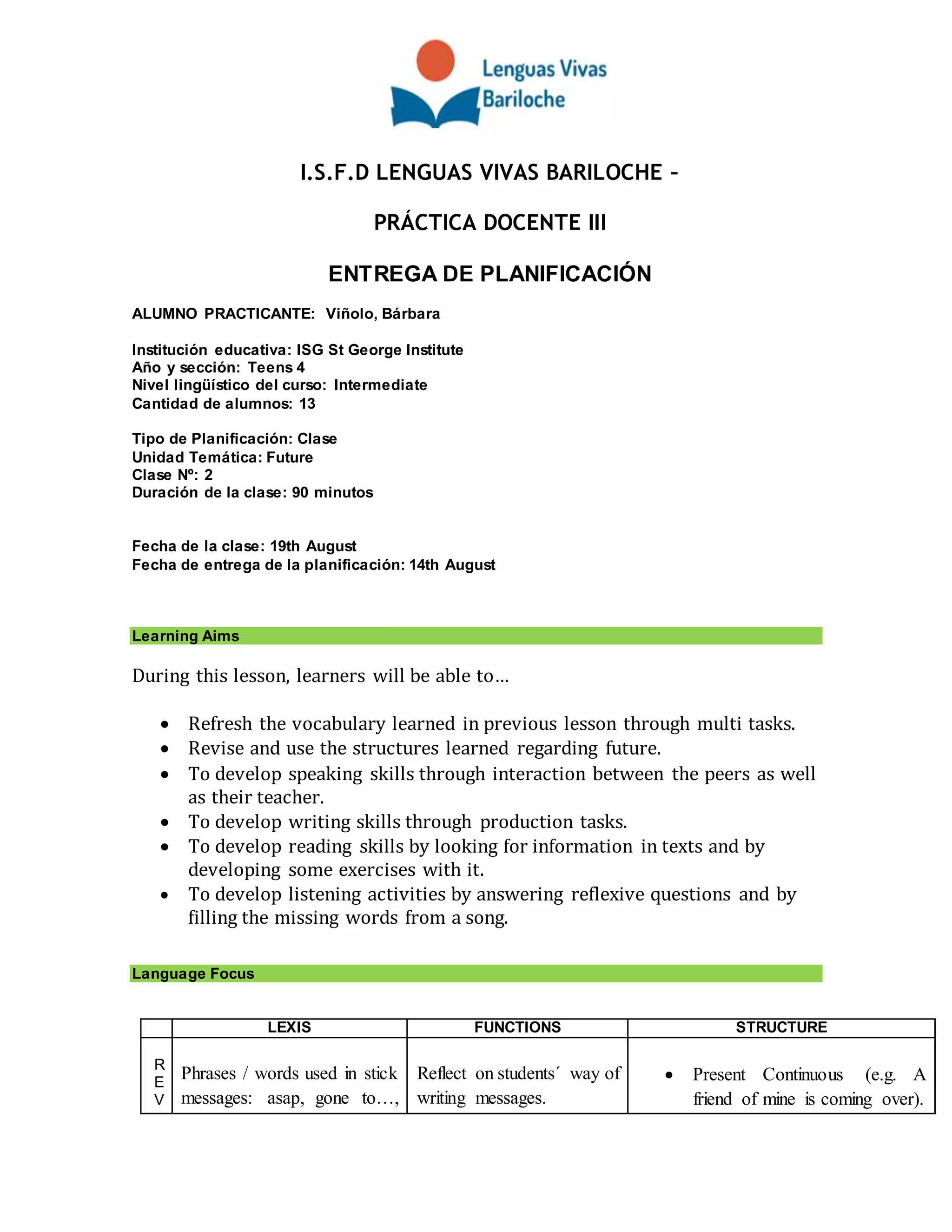 The document provides a lesson plan for a 90-minute English class for intermediate level teens. The lesson focuses on future tenses and predictions about the future. It includes a warm-up activity to review future structures, a presentation of new vocabulary, and three activities - analyzing inventions, reading an article and completing a summary, and discussing predictions. The plan scaffolds learning through examples, questions, and group work. It incorporates various resources including pictures, videos, readings and a board game. The plan aims to develop students' speaking, writing, reading and listening skills related to discussing future plans and predictions.