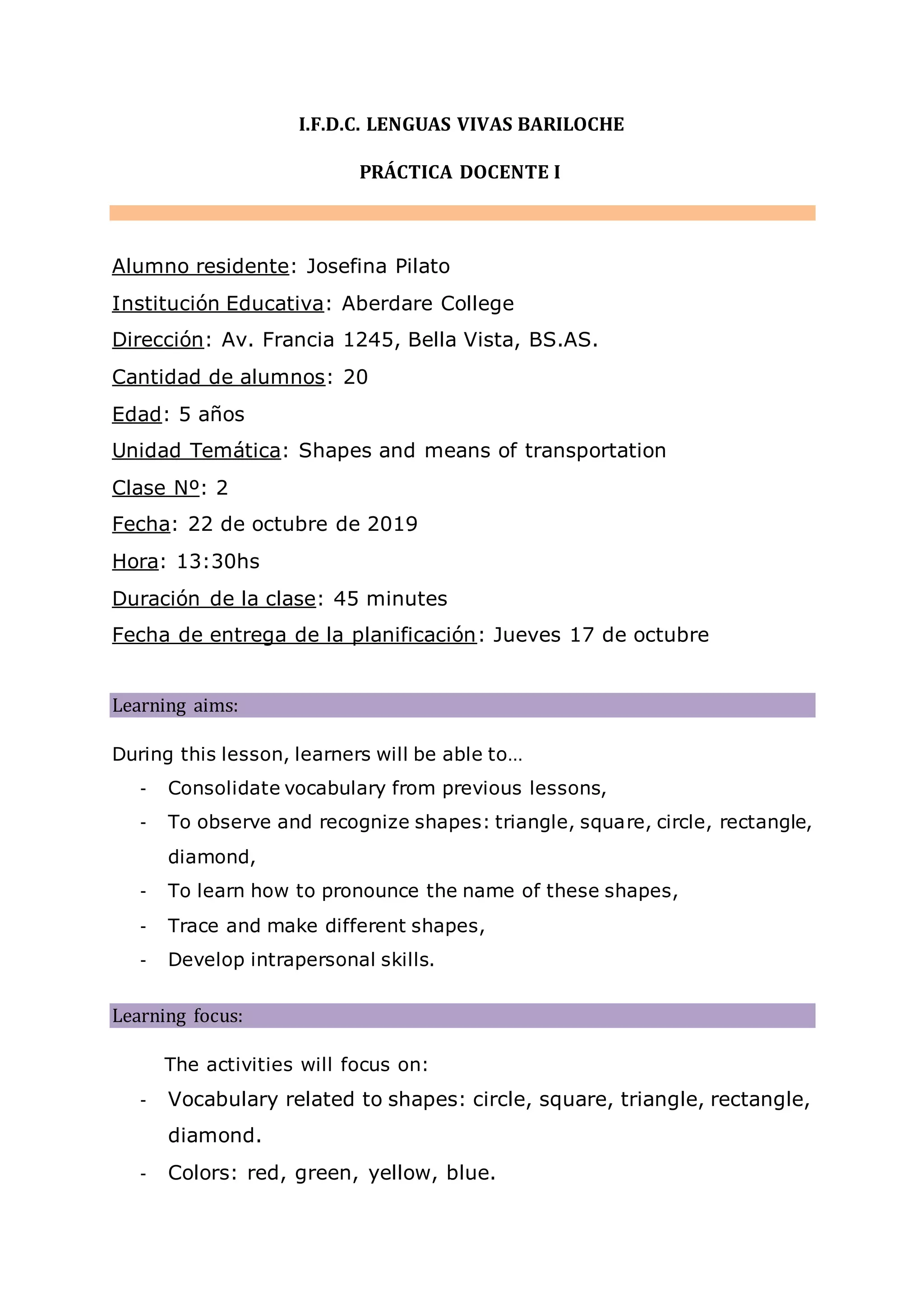 The document provides a lesson plan for a kindergarten class focusing on shapes. The 45-minute lesson has the following stages: a routine singing circle to settle students, a video introducing shapes, presenting a tracing activity where students trace shapes with pencils and color them in, allowing time for the activity, and closing with cleaning up. The plan aims to help students consolidate shape vocabulary, recognize shapes, trace and identify them, and develop intrapersonal skills through individual work. Materials include flashcards, wooden shapes, a video, photocopies, and markers. The teacher provides scaffolding such as modeling the activity and asking questions.