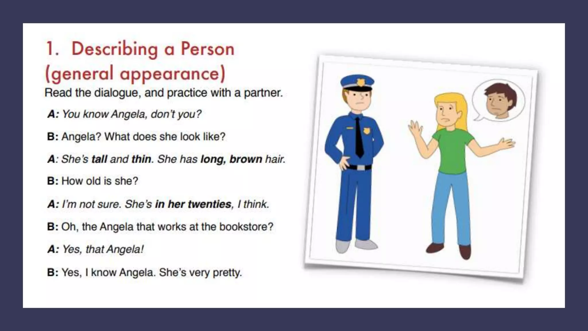 This document provides an English lesson on relationships. It discusses describing people's personalities and physical appearances. It explains how to correctly ask about these by saying "What does she/he look like?" for physical appearance and "What is she/he like?" for character. The document asks students questions about whether relationships require sacrifice and what is most beautiful about relationships. It asks students to describe how to build a great relationship and discuss an important relationship in their life.