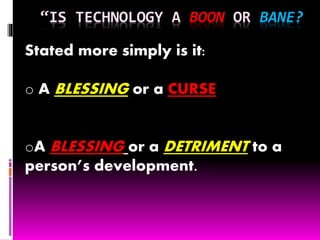Technology can be both a boon and bane depending on how it is used. When used properly, technology provides benefits like enabling communication across distances, disseminating information, making life more convenient, and enhancing education. However, technology can also be detrimental if misused, such as by eroding relationships, distracting from studies, and causing addiction. In education specifically, technology becomes a bane if it encourages uncritical thinking, passive learning, isolation from others, online harassment, or overuse of devices at the expense of active participation.