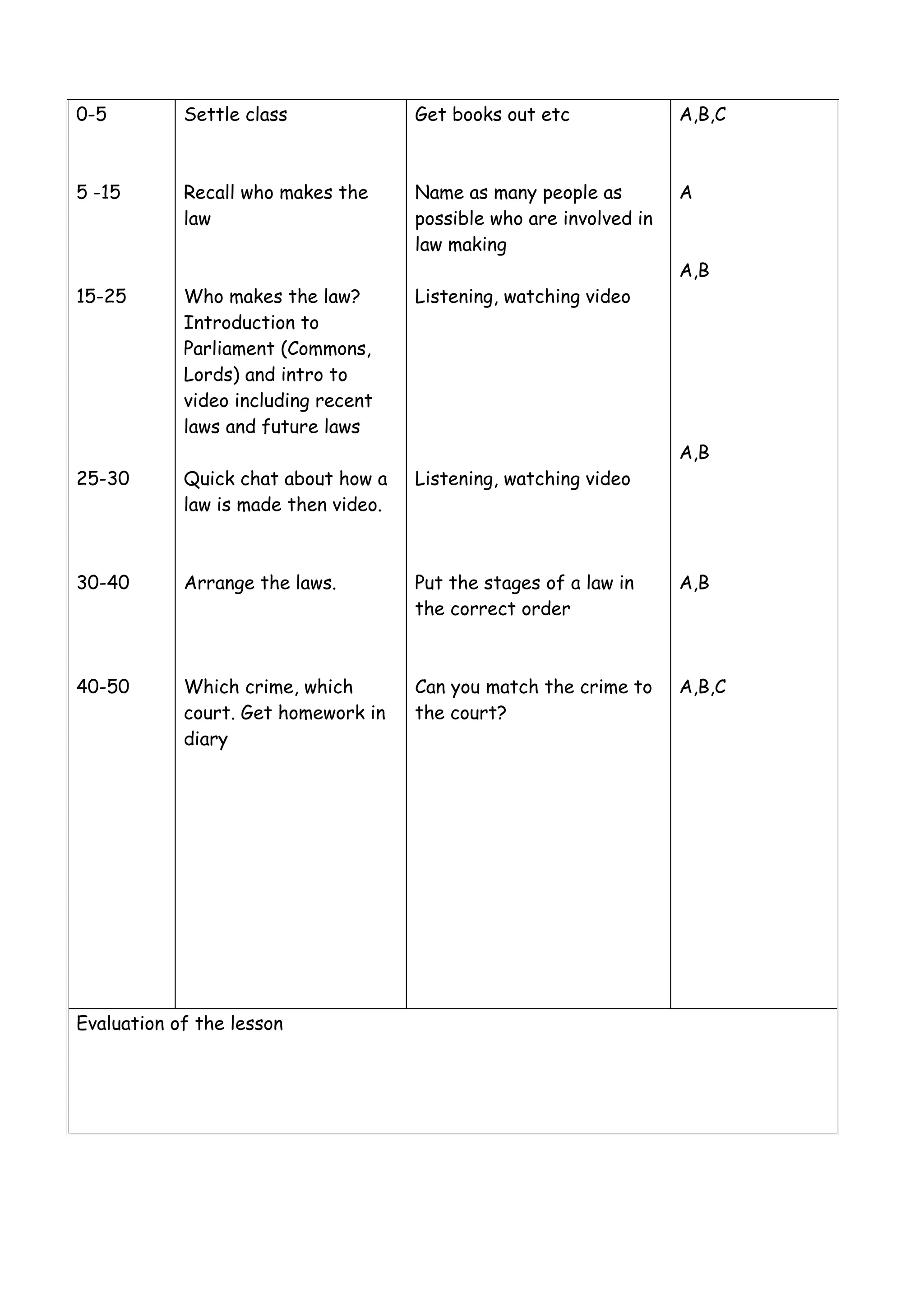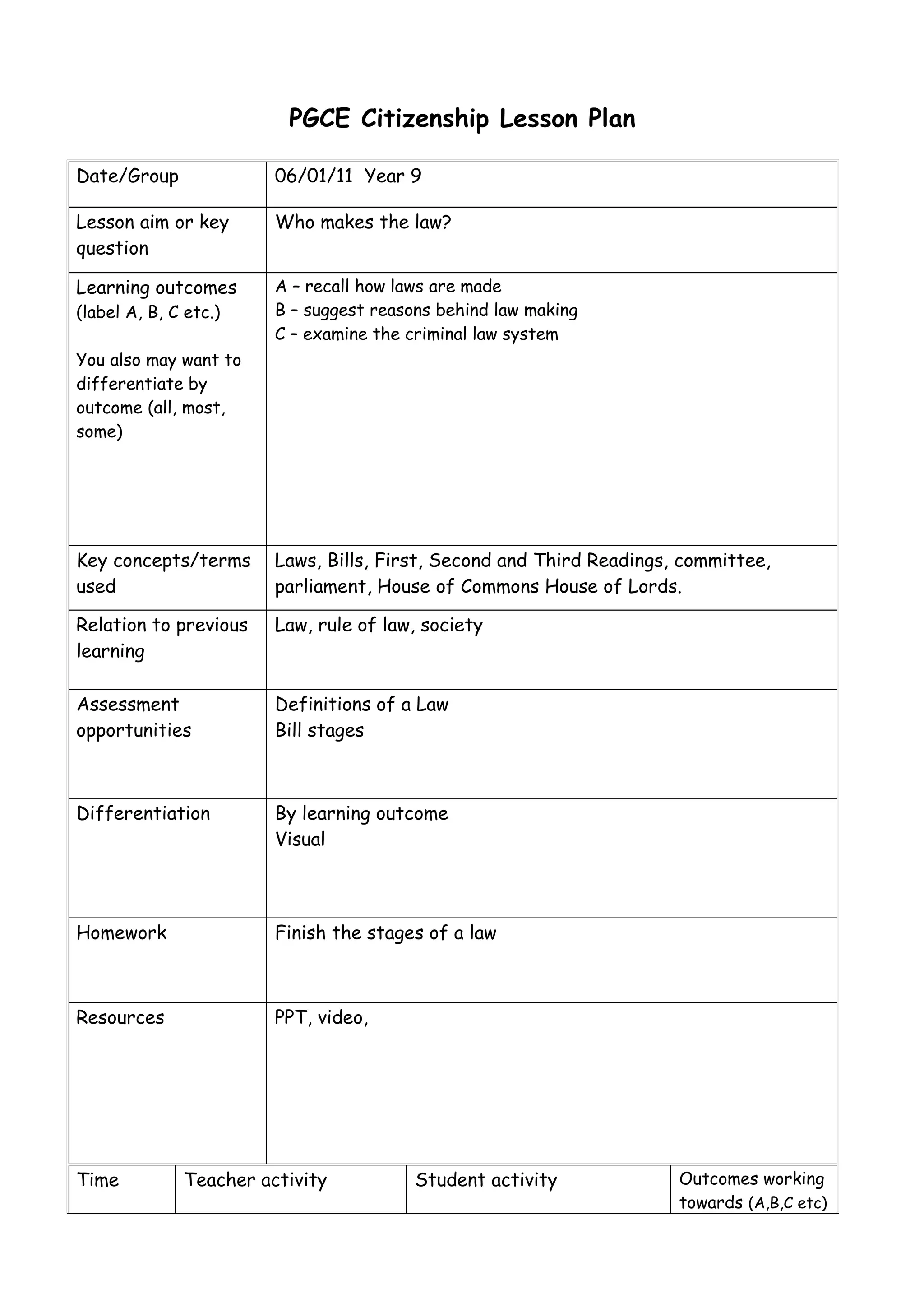 This citizenship lesson plan aims to teach year 9 students about how laws are made in the UK. The lesson will introduce key concepts like parliament, bills, and the stages of creating a law. Students will learn that laws are made by parliament, which consists of the House of Commons and House of Lords. They will watch a video explaining the law making process. The lesson differentiates learning outcomes and assessments for students to recall how laws are made, suggest reasons for laws, and examine the criminal justice system. Homework involves finishing the stages of creating a law.