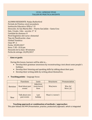 Nadya Rutherford is a student teacher completing her practicum at EPJA n° 15 secondary school in Puerto San Julián, Santa Cruz. She developed a 40 minute English lesson for an elementary level 3rd year class of 8 students focused on talking about past holidays. The lesson uses the PPP approach and integrates CLIL methodology. It includes a warm up activity revising past tense verbs, a presentation of new grammar points, a paired speaking activity practicing the new structures, and a writing assignment. Students are assigned online homework practicing was/were on a blog. The tutor provides positive feedback and notes minor areas for improvement.